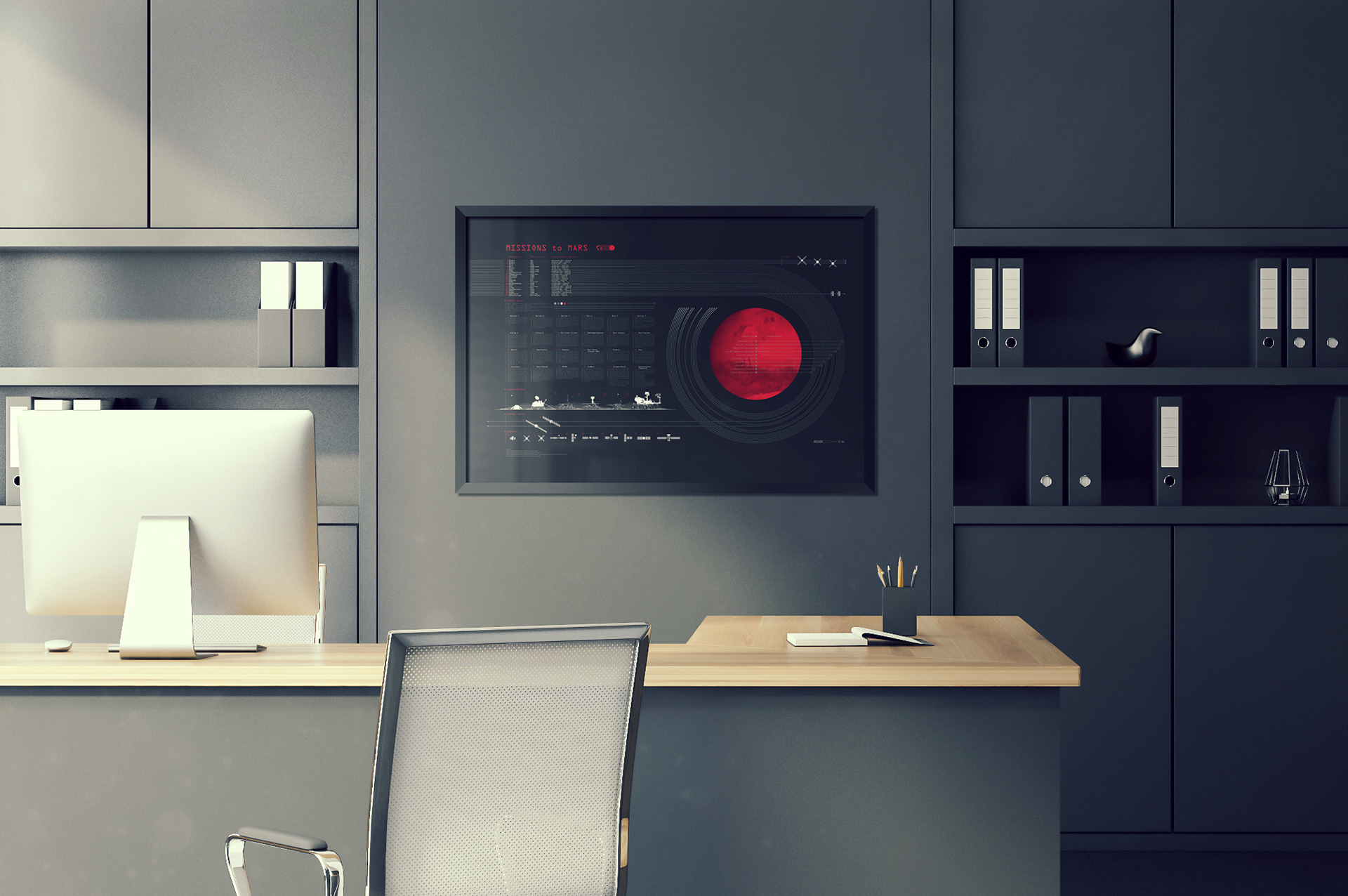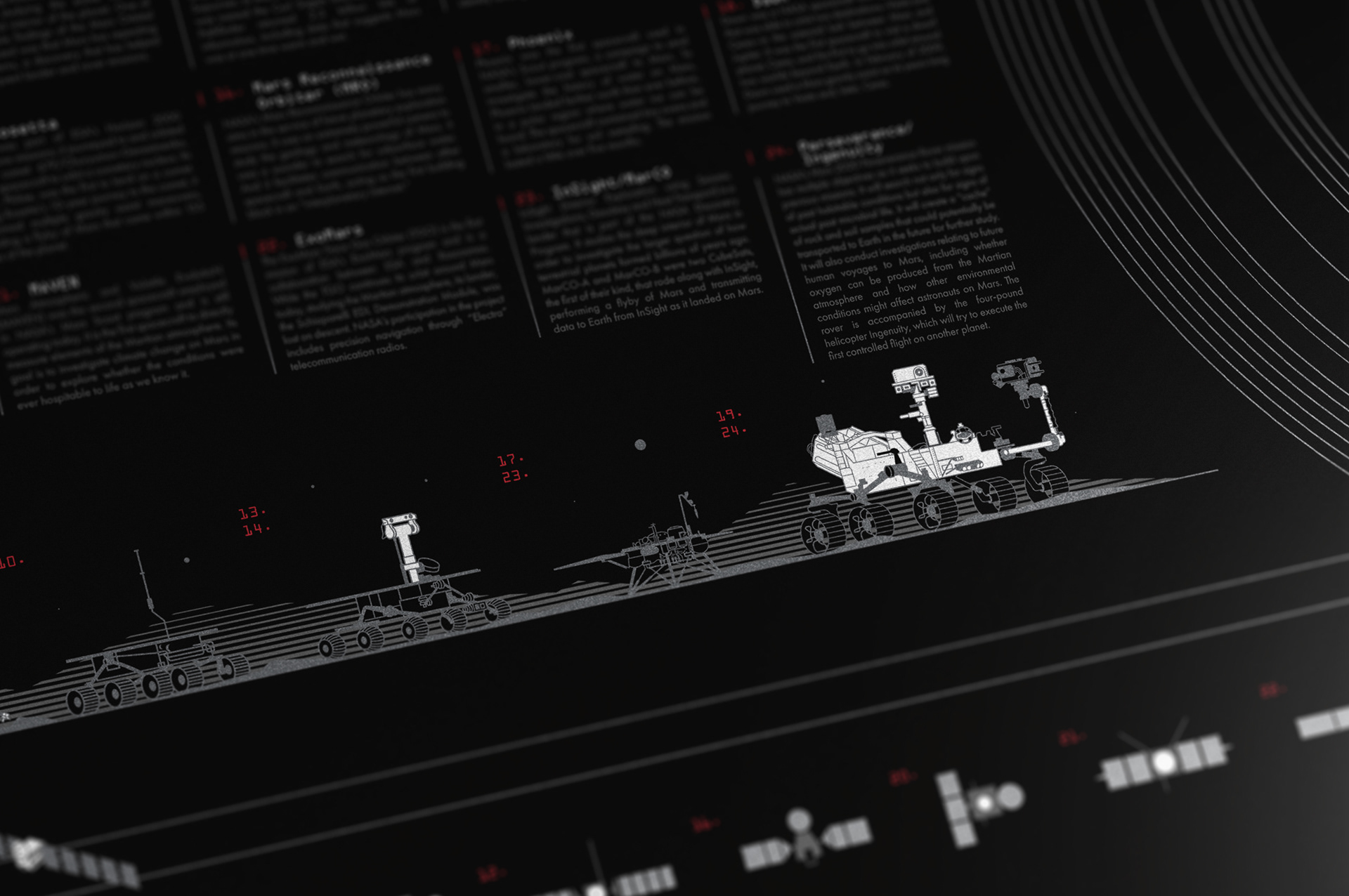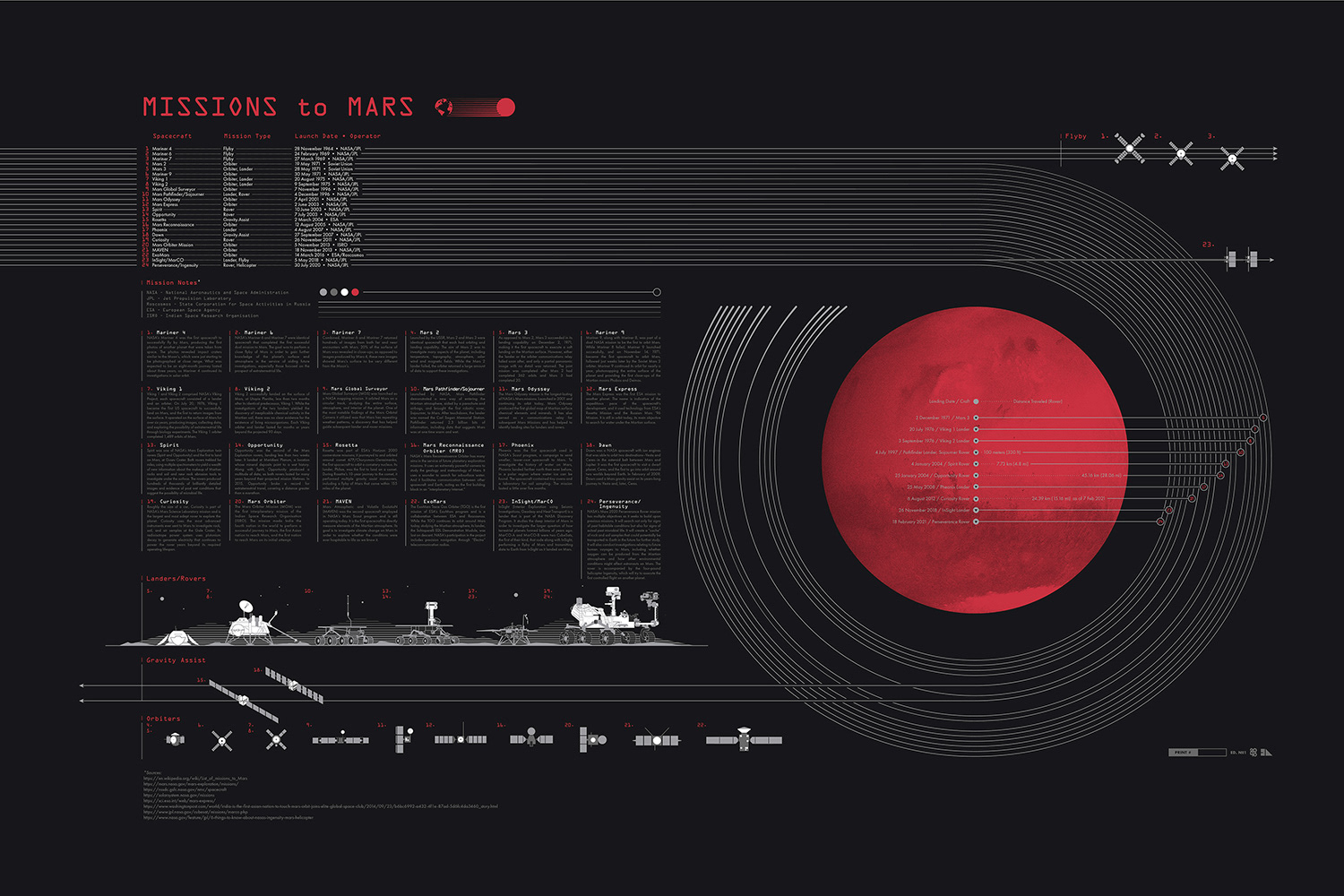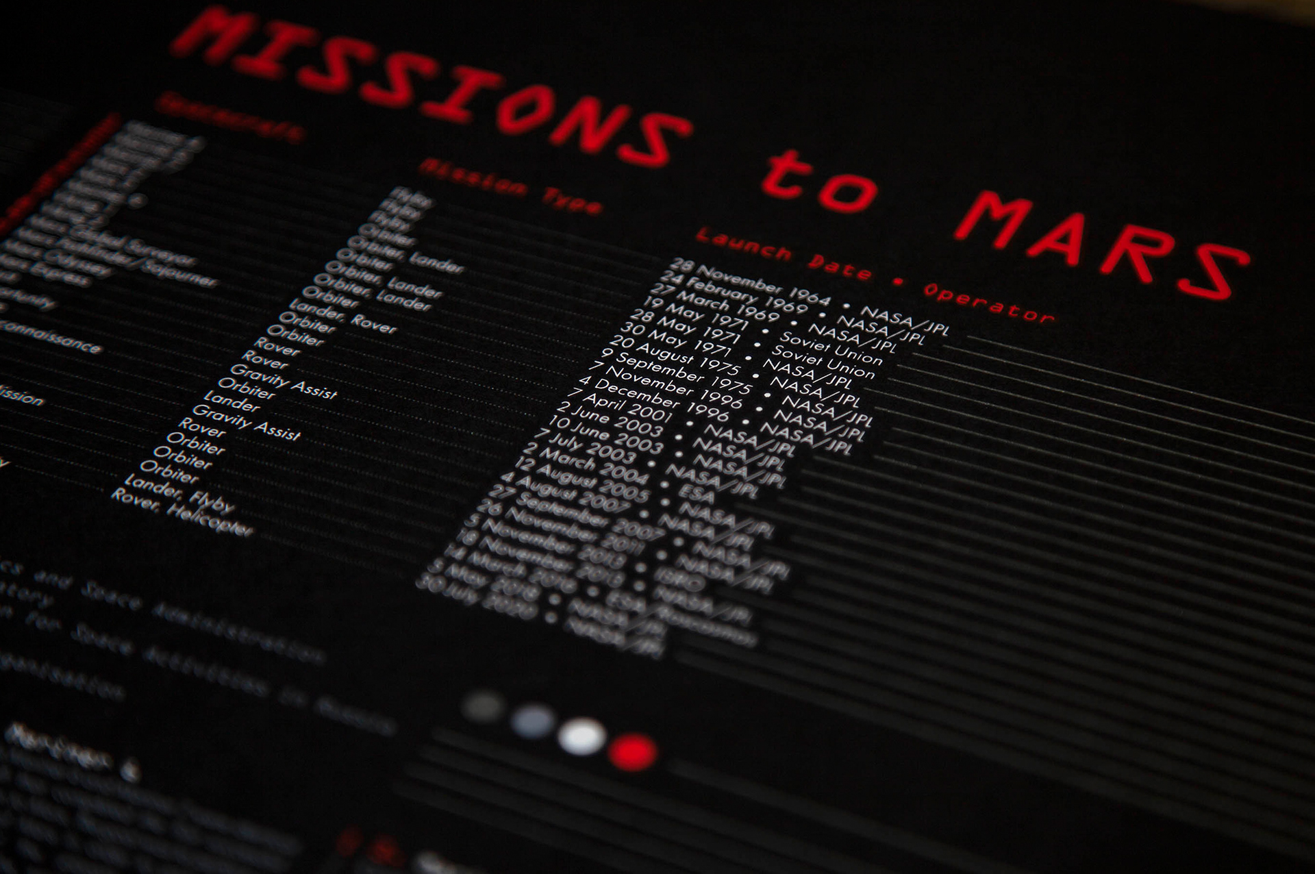 Hand made screen print chronicling every successful mission to Mars from the first orbit to the latest rover.