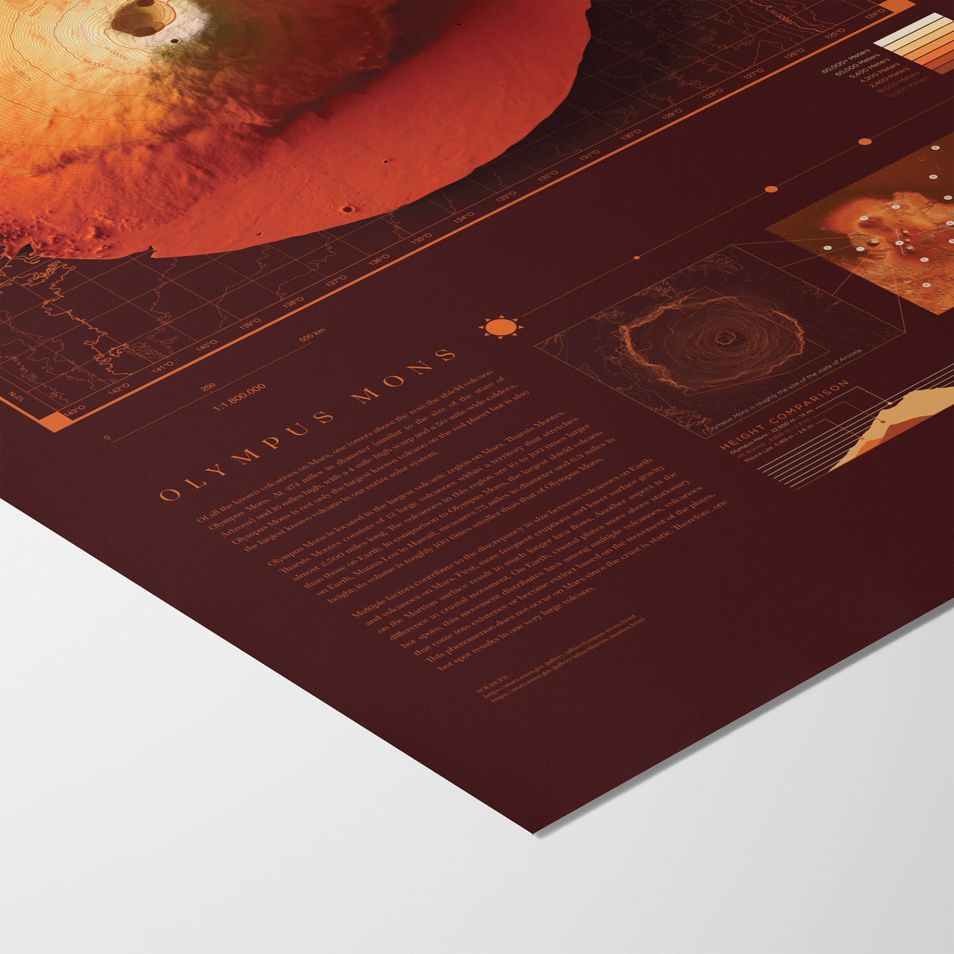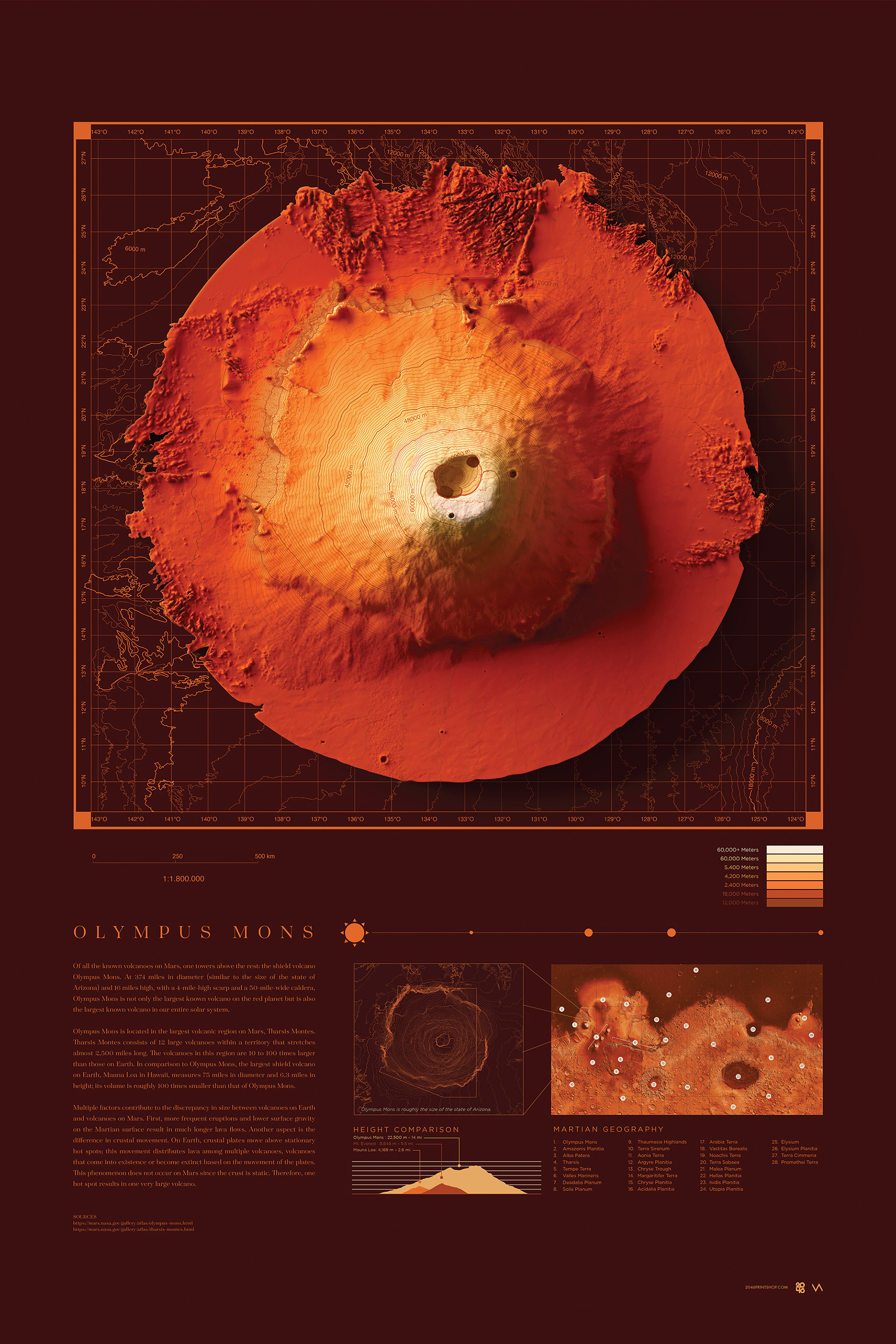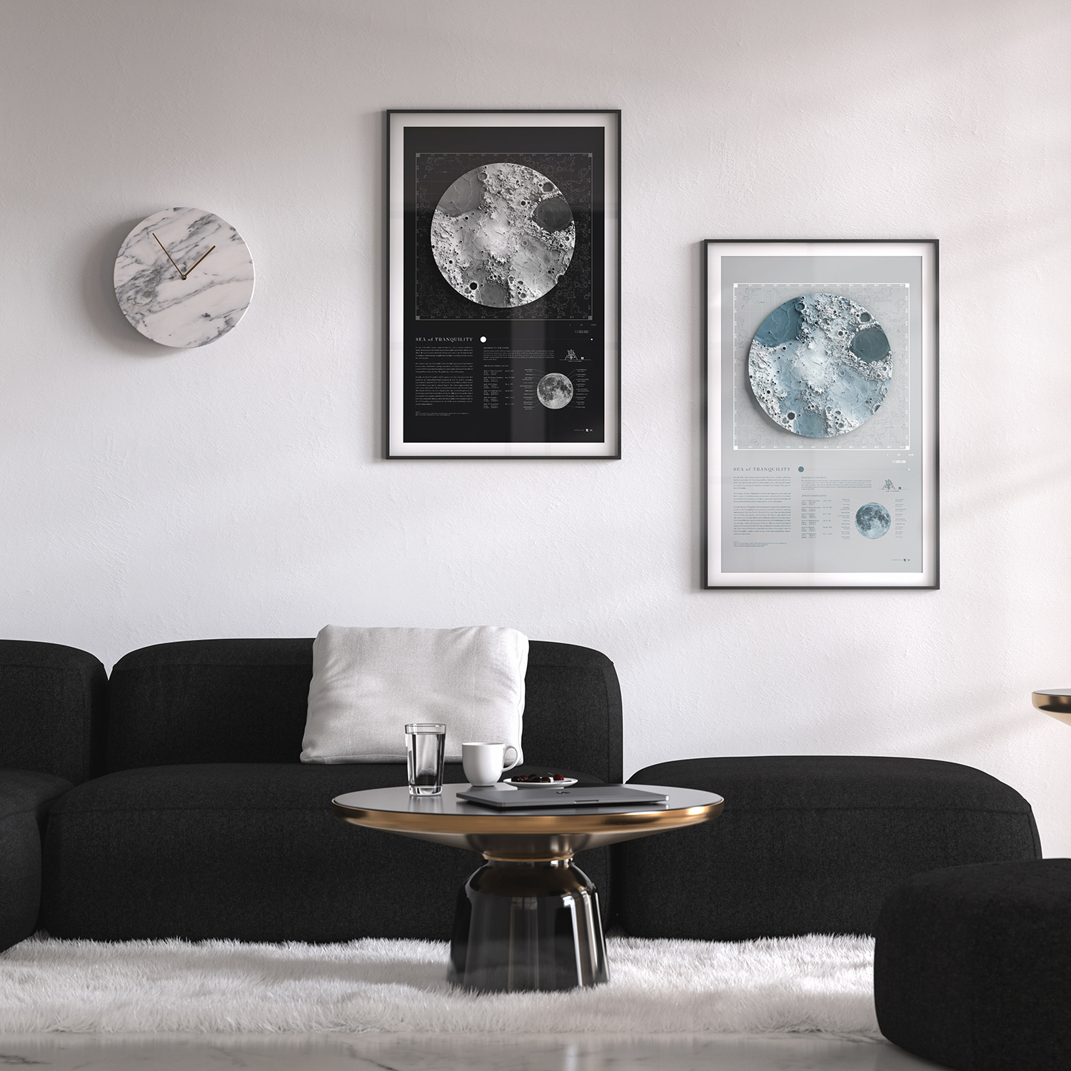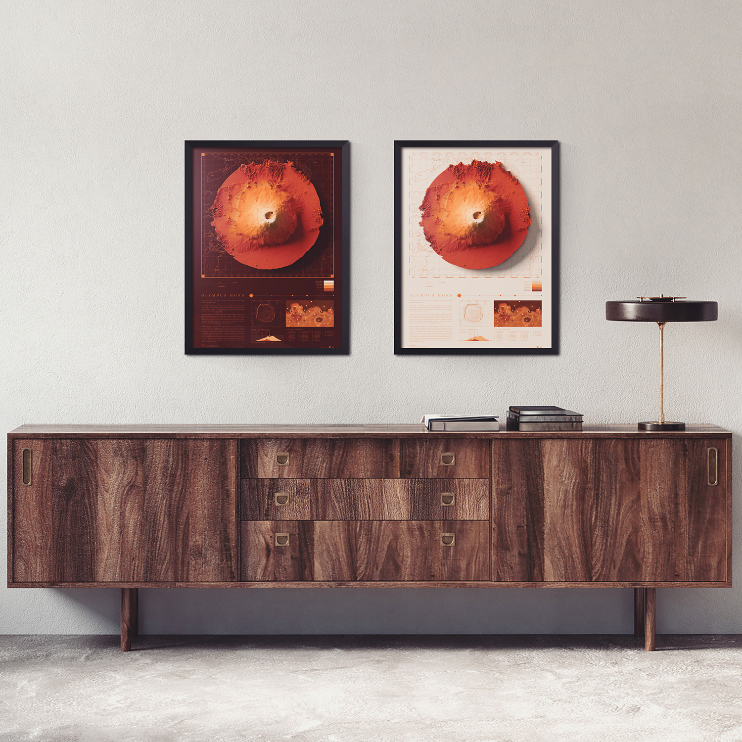 Shade relief posters of the Sea of Tranquility, where humans first took step on the moon, and Olympus Mons, the highest peak in the solar system.