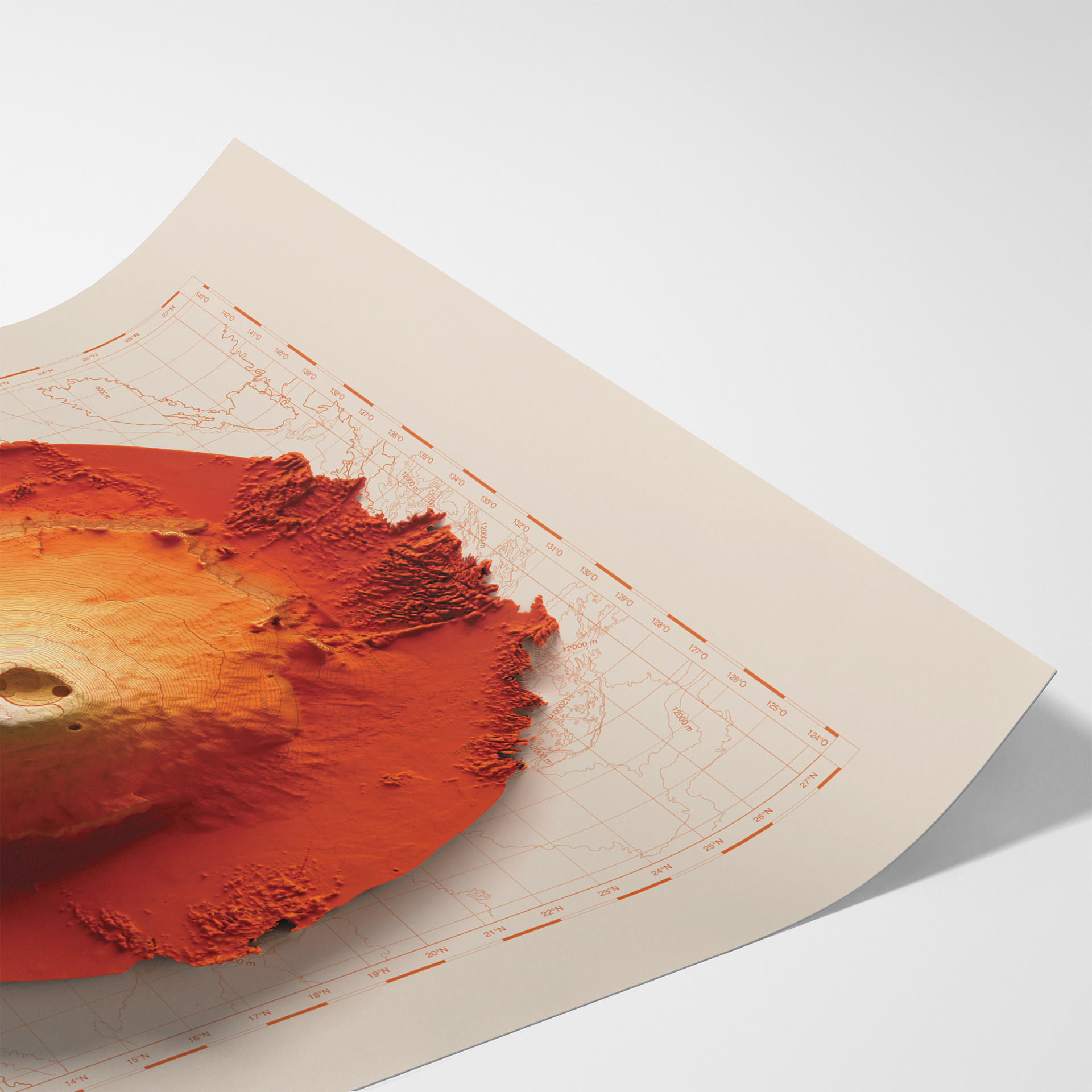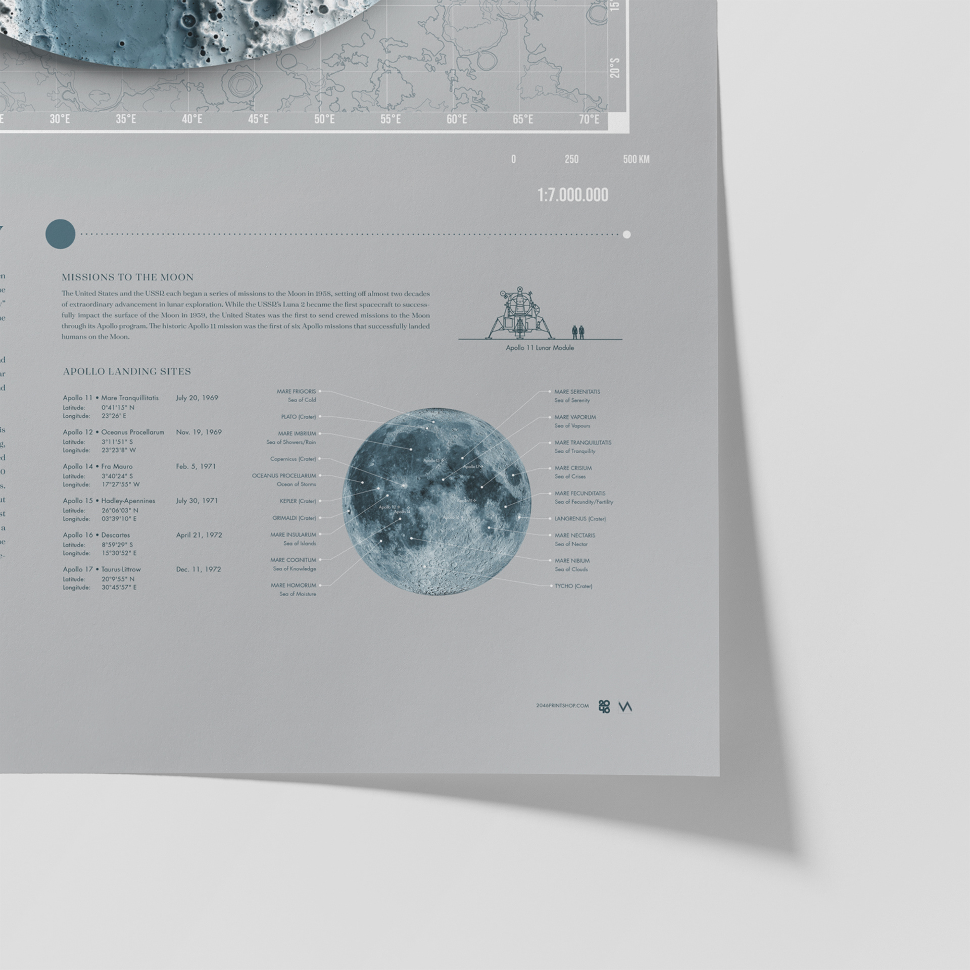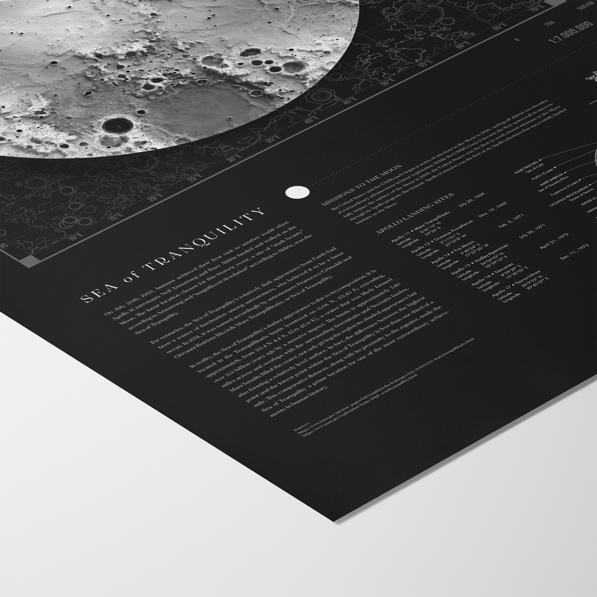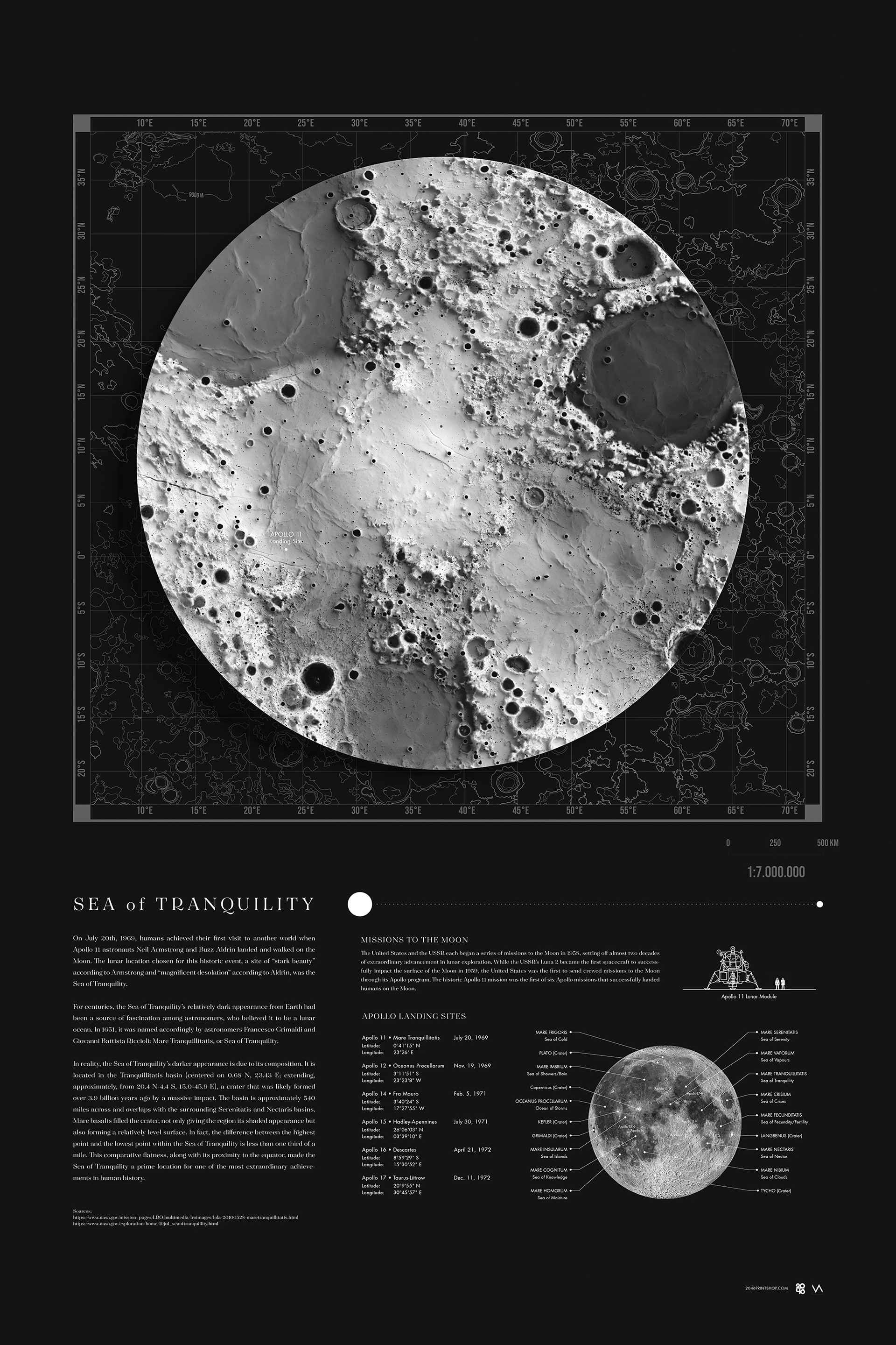 Shade relief posters of the Sea of Tranquility, where humans first took step on the moon, and Olympus Mons, the highest peak in the solar system.